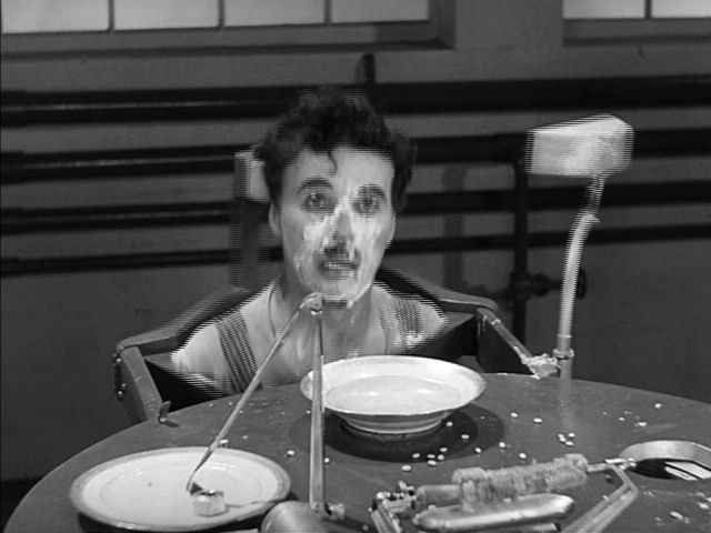 Intending (and succeeding) in parodying the desperate circumstances of the unemployed masses it was never going to be a cheerful film, even for a comedy, but the Tramp gets into some surprisingly heavy stuff in this outing. The film opens with the Tramp working on a production line in a factory. His job is to tighten the bolts on plates as they are pushed along a conveyer belt. The manager (in between doing jigsaw puzzles) constantly demands faster work and uses video screens to yell at workers who slow down. After a disastrous test run with an automatic feeding machine the poor tramp can’t take any more.