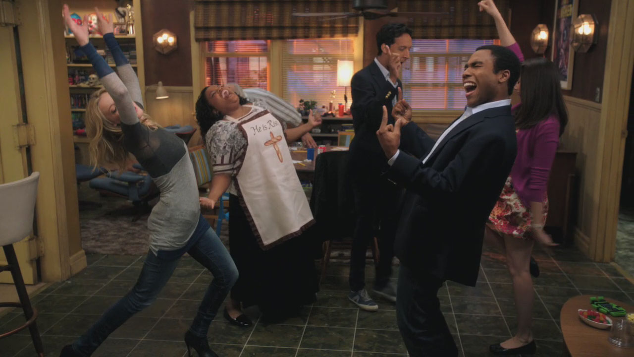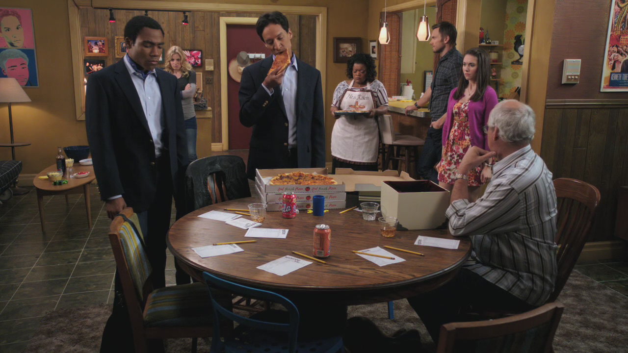 Shirley is assigned to get the pizza, and she does so with a big smile on her face. The only thing she asks is that someone takes out her mini-pies. This causes Jeff to snap about them not feeding into Shirley’s baking addiction. Britta is stopped by Jeff again and goes to the bathroom to get high like usual. Pierce successfully gives Troy his present this time around. It is a twisted Norwegian troll doll (not the jewel belly kind) from Pierce’s mansion that used to freak out Troy. Shirley eventually comes back to find her pies burnt because none of her friends were paying attention. She goes into a big tirade about how hard it is to be an older woman among a bunch of horny singles.