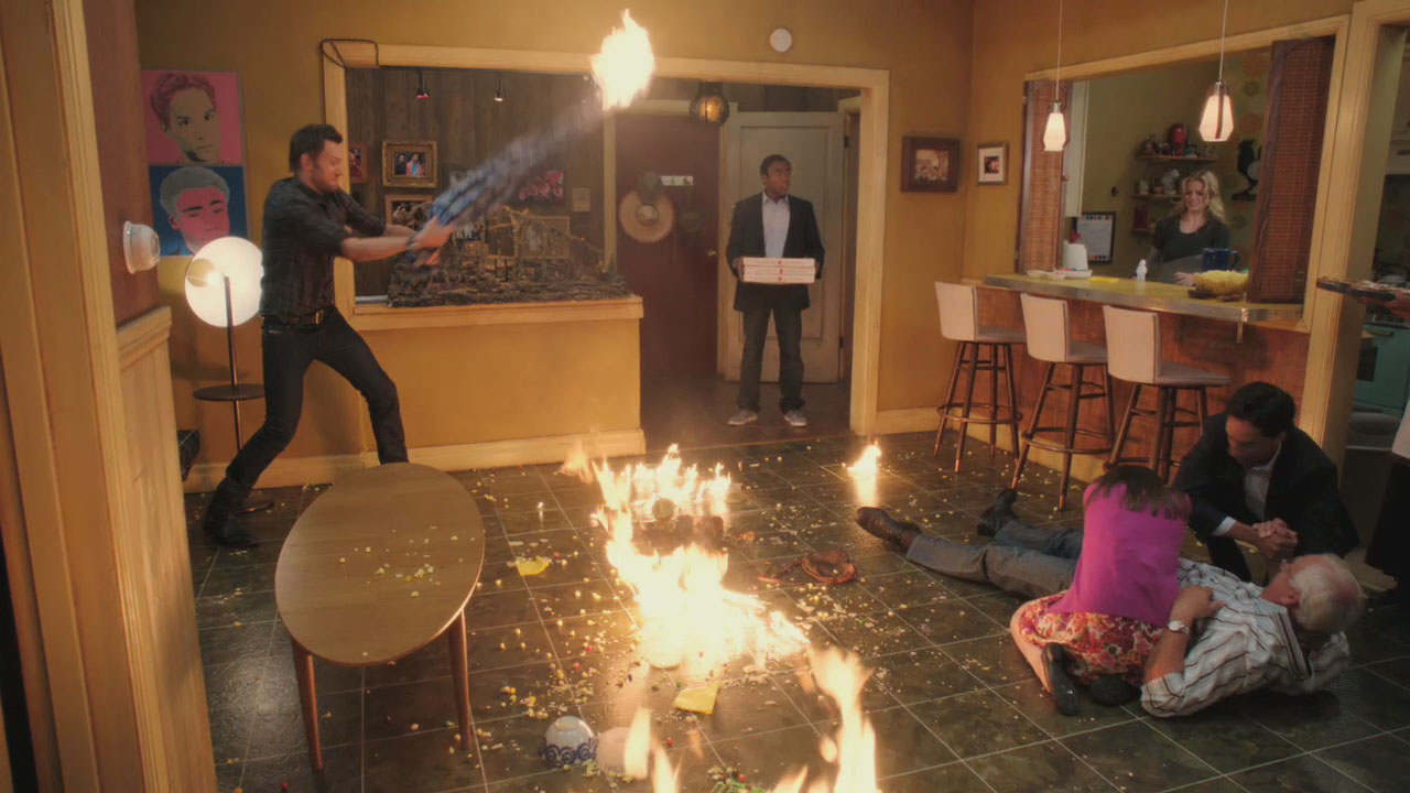 Troy sprints from the room so he doesn’t miss anything. When he slams the door, it causes the boulder from an Indiana Jones play set to fall on the ground. It trips Annie who then knocks a bottle of liquor, Pierce’s gift, and her purse to the floor. The gun in her purse goes off and hits Pierce in the leg. Blood splatters on Shirley and her pies. Britta is so shocked she drops her lit joint on the spilled liquor causing a fire. Jeff and Britta clumsily try to put it out. Troy returns to see the troll doll staring at him from the burnt remains of the gift box. He starts to scream.
