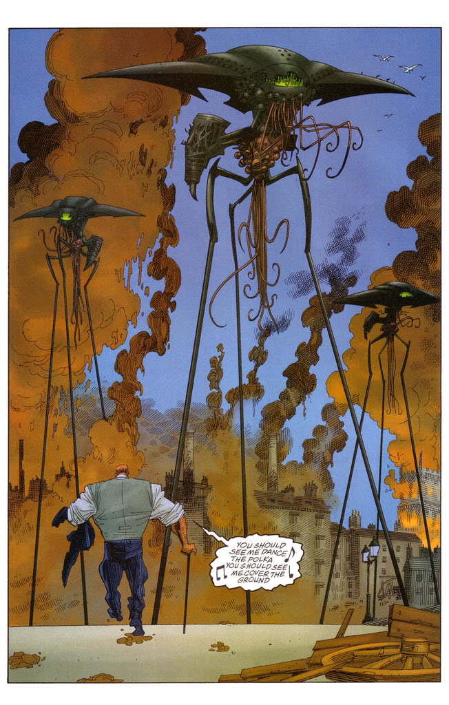During the second volume of Alan Moore’s literary mash-up the forces of Earth and the assembled heroes who make up the League are at the mercy of H.G. Wells’ Martians and their tri-pods. The invaders have marched effortlessly across the land to London, vaporising everything in their path. Having reached the Thames they sat poised to conquer the world. And that’s when Mr. Hyde stepped up. The Martians were so powerful that they had never felt fear. Hearing sound of Hyde crunching one of their own as he gobbled it down changed all that.