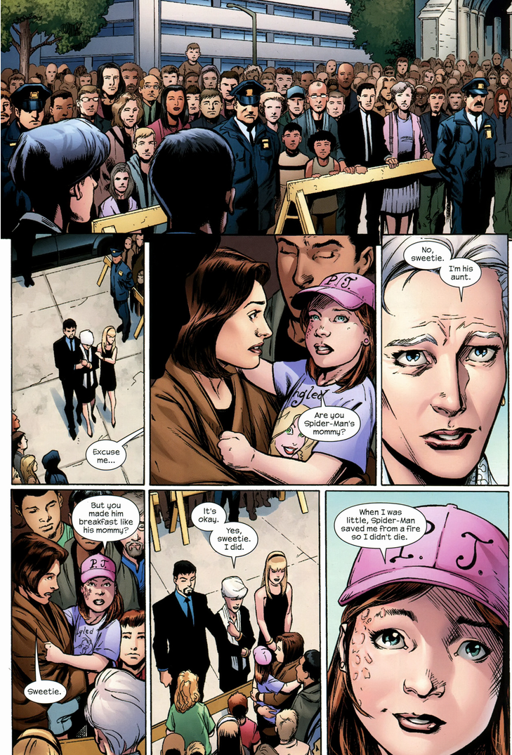 The death of Peter Parker, one of the famous and beloved comic characters in history, was never going to be a cheerful affair. Even in the alternate timeline of Ultimate Spider-Man it was quite a blow, especially as Marvel dedicated substantial ink to his funeral. With the city having now learned the identity of their hero the population of New York turned out in spades to mourn him. Aunt May is intimidated by the silent crowd but puts on a brave face until one little girl with a heavily scarred face gets her attention. Asking if she was Spider-Man’s mother she explains that Spider-Man saved her from a fire when she was little.