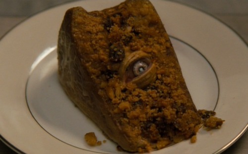 There’s also the fact that each time the ‘Spirit’ comes into play Christine is near food, she only gets attacked in the kitchen or when food is placed in front of her, hence why the cake has an eyeball in it, she’s forcing herself to be disgusted by it and not eat it.