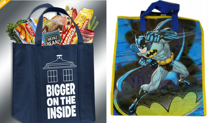 This is something everyone can do but for those of a geeky persuasion there are some really cool bags out there you can buy. Use them to go shopping for clothes, food, Batman figurines, whatever! A quick Google search can turn up a plethora of styles, or you can use websites like Etsy, Amazon, Ebay, etc. Even your basic department stores like Wal-Mart and Target have them. Check out this awesome Doctor Who bag from Ebay.