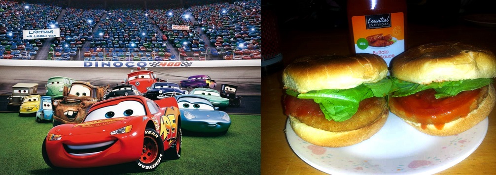 Cars is filled with fast-paced, spicy characters and combines the all-American sport of NASCAR with the gorgeous landscape of the American Southwest. I immediately thought “buffalo sauce” when I thought of this combination. This isn’t really a recipe but it’s certainly a great idea: make a breaded chicken sandwich (in my case, frozen soy “chicken”) and top it with lettuce, tomato, and of course: buffalo sauce! Having the sauce in your fridge is a great idea because you can use it for anything from wings to sandwiches to dips and it spices up any meal, just like Lightening McQueen!