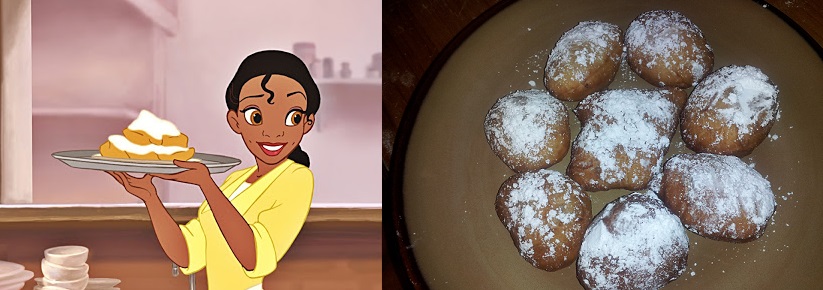Dessert for this meal was also an obvious choice. Tiana is famous around town for her “man catching beignets” that she brings to Charlotte’s ball where she eventually kisses frog Naveen and is transformed herself. These are quite simple to make (try this recipe) as well as being incredibly delicious. If you’re never had a beignet, they’re similar to fried dough or funnel cake. You just plop pieces of dough into a fryer and then cover it with powdered sugar. My friends and I had a lot of fun (and made quite a mess) making these and it only added to the experience.