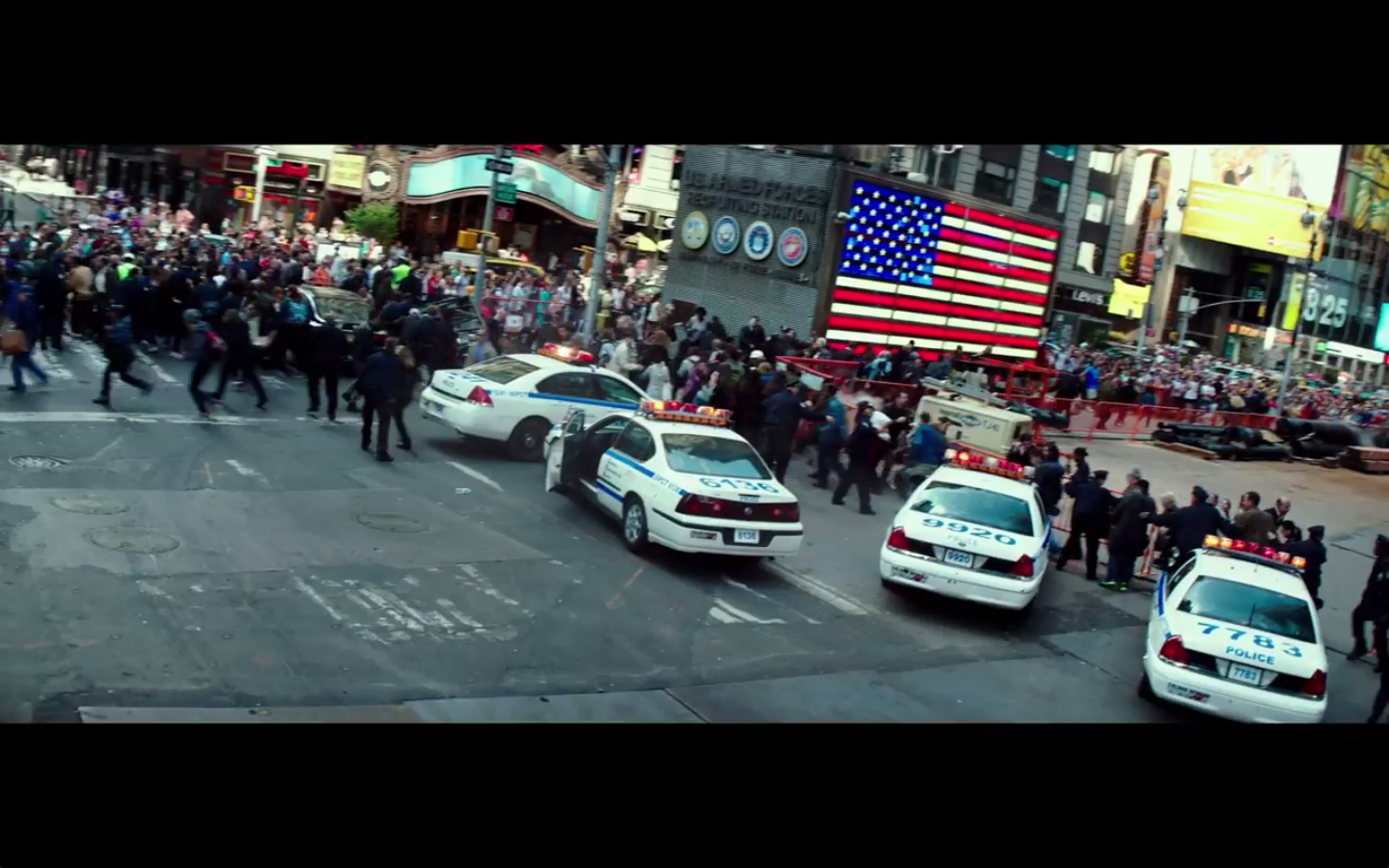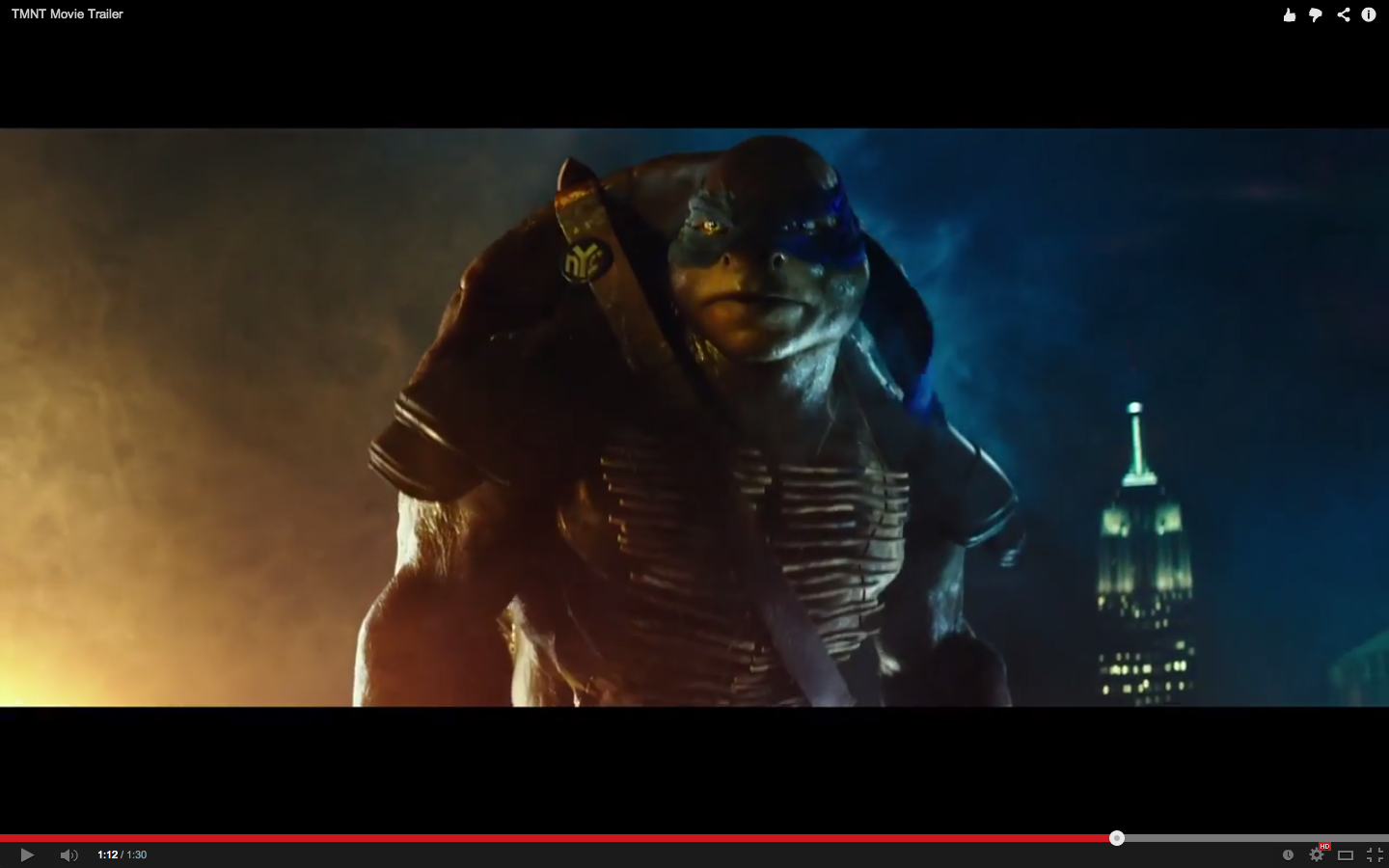 Blocky titles with lens flare: check. Glitchy mechanical drone sound: check. Slowmo footage of action scenes: check. Random footage of urban carnage including a helicopter: check. Is Michael Bay aware this is a separate franchise to Transformers because this could easily be confused for a Transformers trailer before the reveal of the hideous turtles themselves.