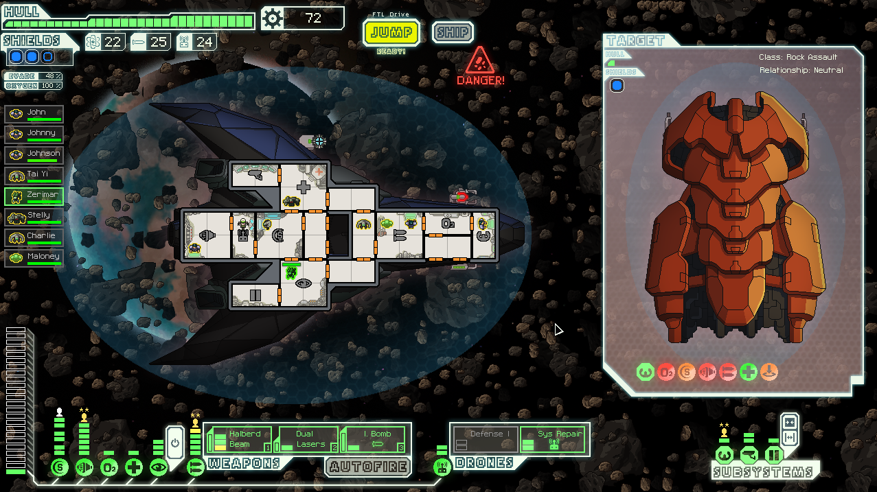 The story is simple. You carry secret information and the rebels are on your tail. You have to navigate space by using your lightspeed warp drive to leap from node to node, with random events playing out in or against your favour. On board your ship you direct your crew to manage the most important system during combat with enemy ships. When in combat you wait until your weapons charge before aiming them at particular parts of your enemy ship in order to place them at a strategic disadvantage, such as knocking out their shields or the weapon systems. In between missions you may encounter random events where you can make a decision to stop and interact or move on by and shop for new items in the stores.
