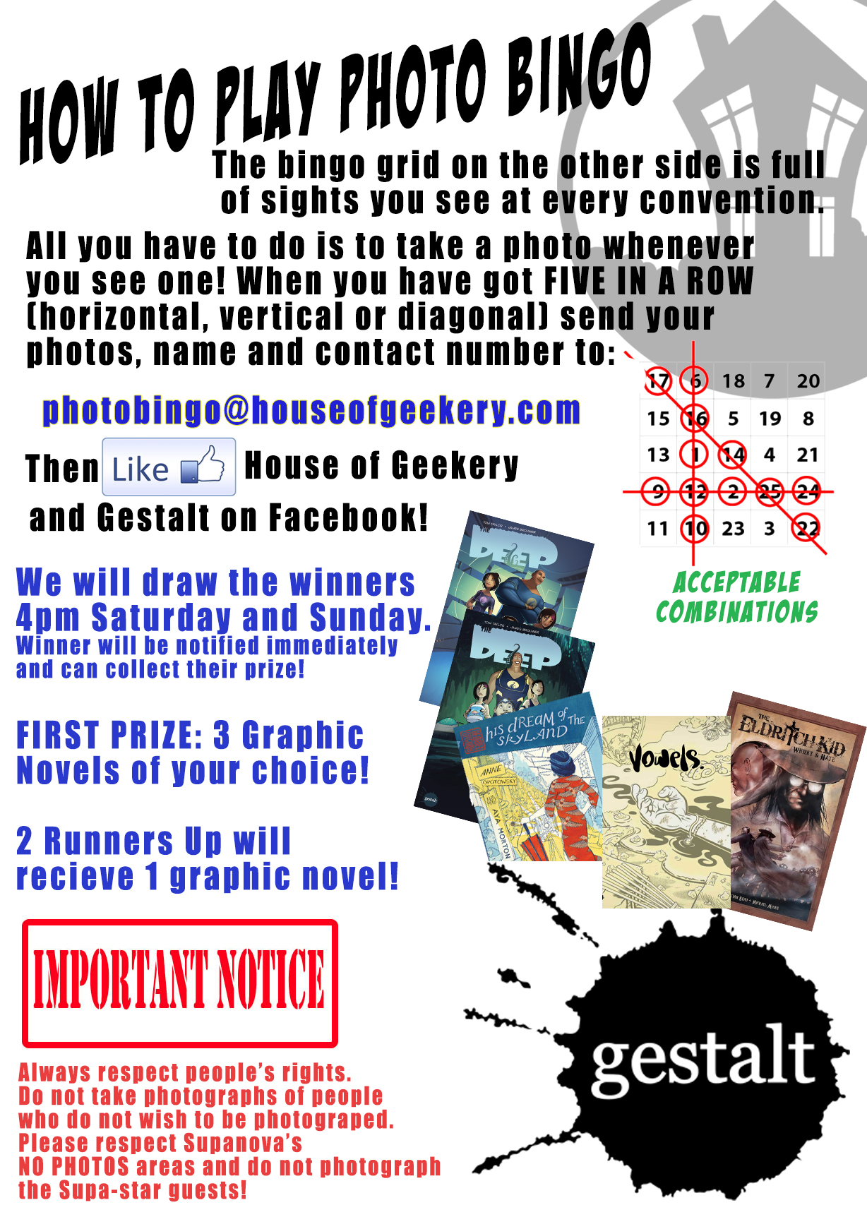 We’ve assembled these funky little bingo cards featuring a range of sights common to big geeky conventions. Snap photos of these things when you spot them – cosplayers, tees, merch, posters, etc. – and when you have five in a row you can email the images to us and you’re in the running! HAVE FUN!
