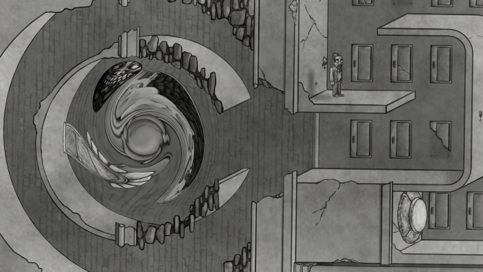 Based heavily on the works of M.C. Escher – to the point that the loading icon is one of his sketches – each level includes puzzles based on optical illusions caused by perspective and gravity. The protagonist, mathematician, can be moved left or right using the A and D keys while the entire level can be spun on an axis using the arrow keys. Using a combination of the two the player must retrieve any keys and make it to the door. Every ‘world’ introduces a new element to the game including vortexes that trap anything entering them in place, alternative ‘white’ world that intersects with the normal world and veils that protect the player while gravity is moved.