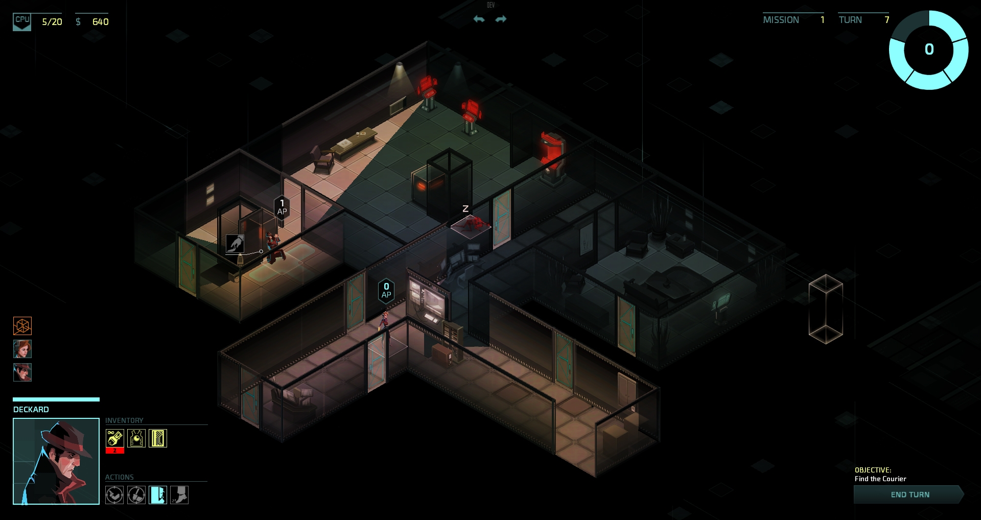 From the beginning of the game you have a world map with a couple of options of levels and a time limit in which to achieve as much as possible. The levels are procedurally generated so every play through will be different. The control scheme is very simple to get the hang of – right click on the spot you want to move to, hover the pointer over a door or object to bring up the options for it (peeking being a very handy one) and select want you want to do. When you hover the mouse over any space it shows you how many Action Points will be left after following through, which is an immensely handy mechanic. Just in case this is starting to sound like a nice, relaxing game to think out your strategy there is a ticking clock on each level that ramps up the difficulty the longer you remain.