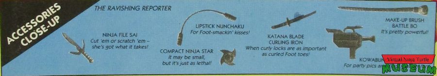 Clearly the first thing we need to address here in the three variants of April in the front row. Technically they’re called ‘Ninja Newscaster’, ‘April’ and ‘Ravishing Reporter’ but we’re going to call them ‘Cavewoman’, ‘April’ and ‘Hooker’. That ‘ninja’ outfit is only going to be of use if you’re trying to blend in with a pack of zebras. Then there’s the items you get with the ‘ravishing reporter’.