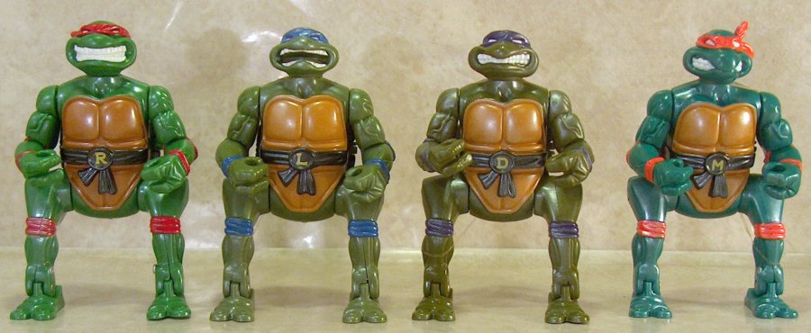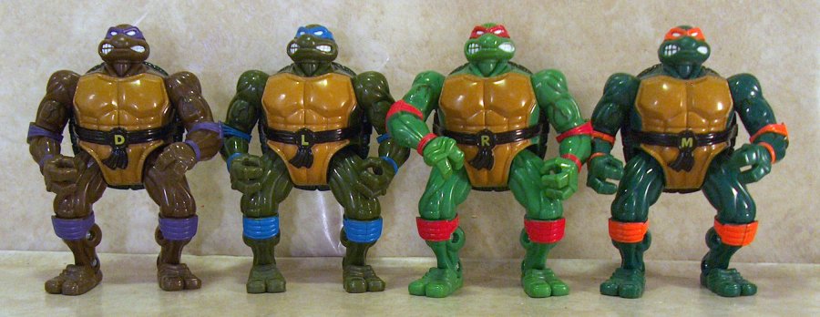 This foursome are the ‘pizza tossing’ turtles, and I presume that they fling regurgitated foodstuffs from their gaping torso cavities. Nothing can explain those facial expressions though. Perhaps someone slipped some acid onto their slice.