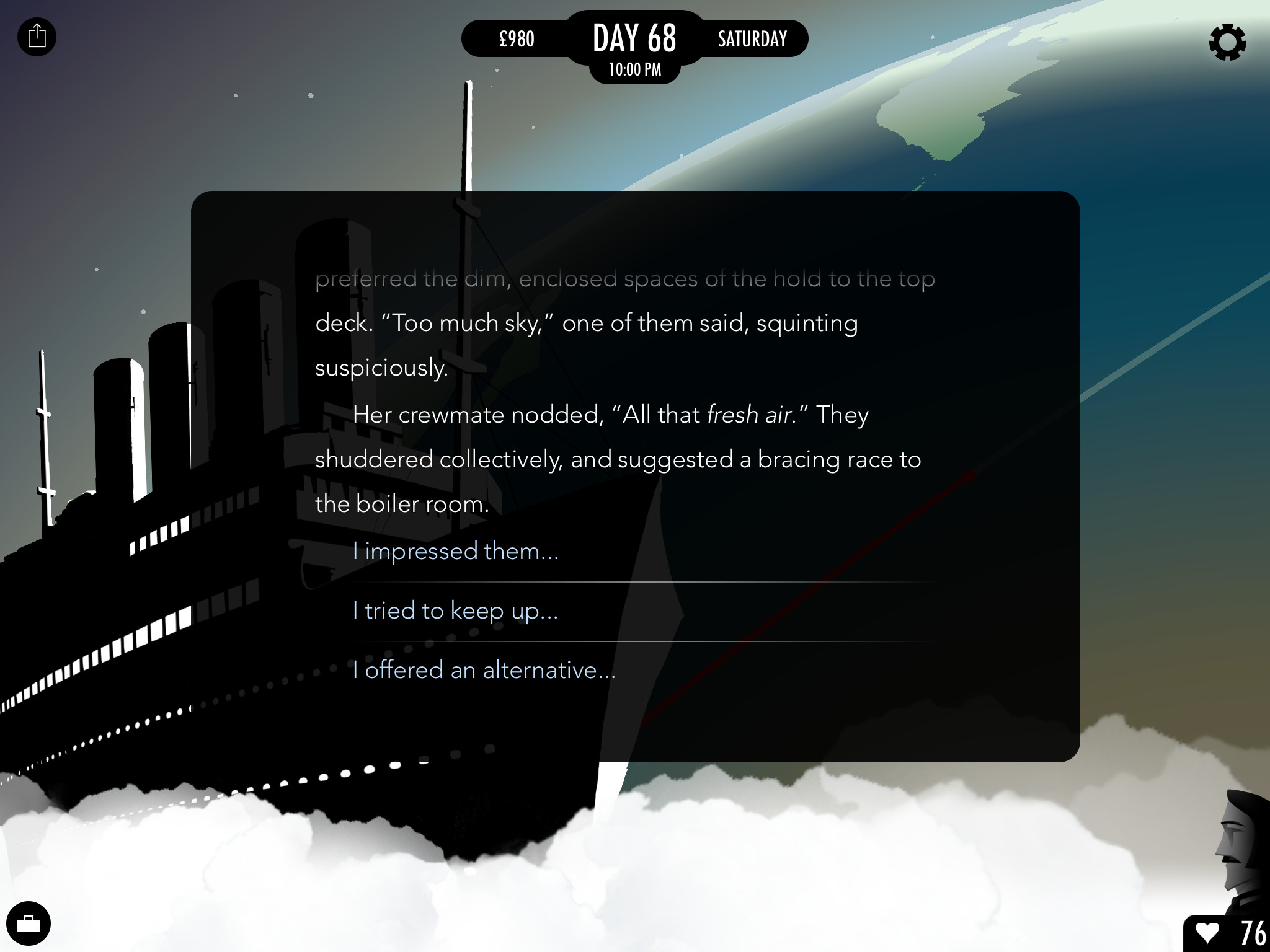 At least that’s what I thought. Turns out the occasional gem shines out amid the shit and one of those gems is 80 Days. A Choose-Your-Own-Adventure style story game with simple RPG elements and set in a Steampunk variation on Jules Verne’s classic novel Around the World in 80 Days. You take on the role of Passepartout, valet to the British Gentleman Phineas Fogg who has taken on a wager to travel the world London to London in 80 days. It seems a simple enough task – and a single-minded player can complete it with weeks to spare – but the true adventure is in the journey.