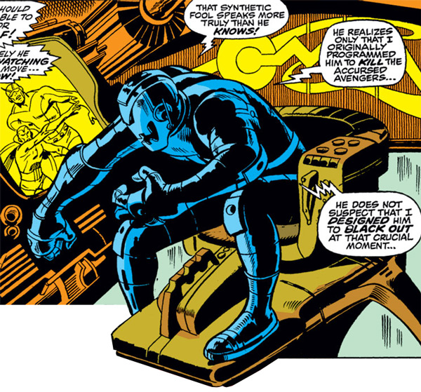After hypnotising Jarvis as a method of infiltrating the Avengers it is revealed that Ultron was the creator of the synthetic human Vision, a core member of the Avengers. In a twist of fate it is Vision who, along with the Avengers, destroy Ultron-5. Through some deft retconning it is revealed that Ultron was originally built by Hank Pym as an experiment in AI. As Ultron’s intelligence developed he rebelled against his creator – developing a deep hatred for Pym – and becoming obsessed with Pym’s lover Janet (Avenger’s founding member The Wasp). To round out this sci-fi comic book Oedipus tale Ultron hypnotises Pym so he’d forget that he built the machine.