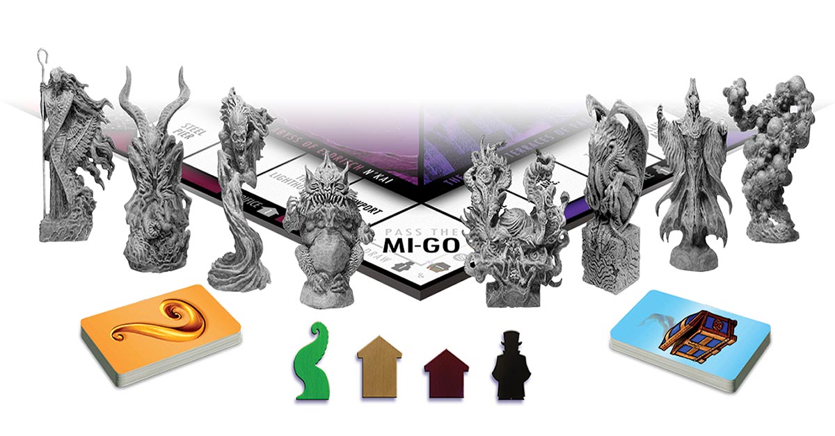 Paul Komoda’s highly detailed, intricately carved figures of Lovecraft’s monster mash are the star of the show. They are without a doubt the most amazing player pieces in my game collection. The jarring contrast between the bright, cartoon style arts across the rest of the game only adds to the fun, and players will enjoy stamping their massive Elder God along the happy, goofy looking board. I’d say 90% of the reason I went out and bought it was for those figurines.