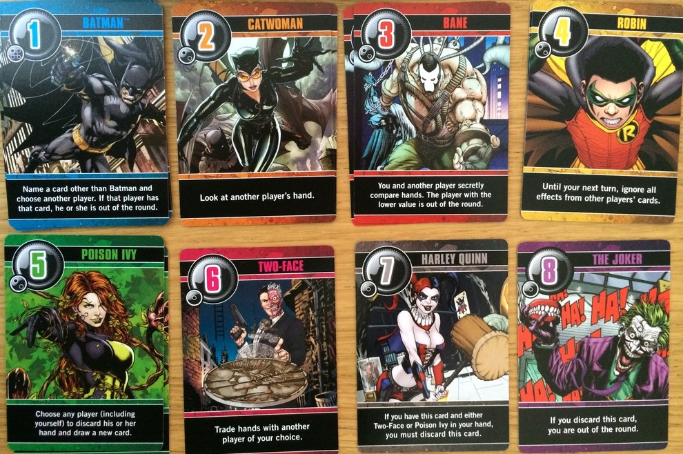 You may be wondering how the scenario translate to the comic world of Batman – delivering love letters to the Dark Knight seems a touch out of character. The switch up is pretty imaginative. Now holding a character represents the villain you’ve caught, with the Joker being the most valuable. Batman replaces the Guard card (valued at 1 point) who can guess what card another player is holding and Robin fills in for the Handmaiden you protects your hand.