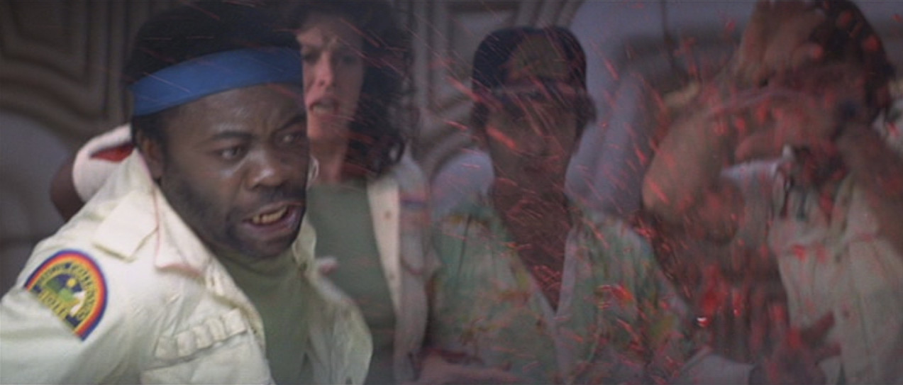 Kablammo. The prosthetic torso explodes with fresh blood and entrails from the local butcher shop, very literally splashing the horrified cast with gore. That look on Veronica Cartwright’s face, where she looks like a friend suddenly exploded blood all over her? Yeah.