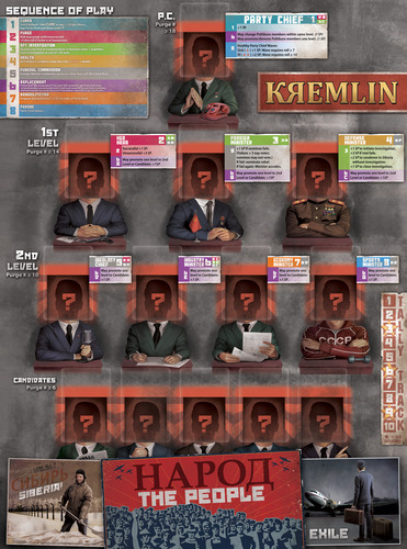 It goes like this. Each player is a shadowy member of Soviet era Russia politicians. Not a member of the political hierarchy but someone who pulls the strings behind the scenes, playing the system to put the politicians in their pocket in a position of power to serve their own needs. The board depicts a pyramid of political positions with the Party Chief at the top and members of the public at the bottom, with positions like the KGB Head and Foreign Minister arranged in layers of power. Once the politician characters are randomly assigned to roles the players secretly record which ones that have ‘influence’ over, and how many influence points they have on a character. This forms the core mechanic for gameplay, and the most intriguing aspect of the game, as the player who controls the party leader at the end of the game wins.