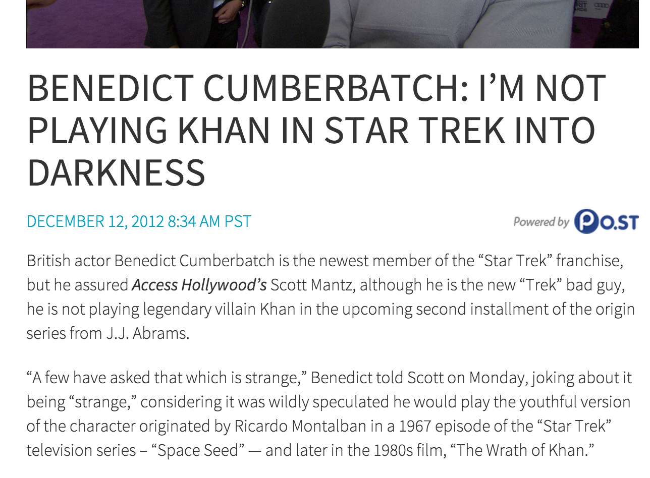 Cast your mind back to 2013, waiting for Star Trek Into Darkness to get released. We didn’t know much about the plot, but a lot of the marketing focused on the casting of break out star Benedict Cumberbatch as the villain. But who is he? He’s a severe, dangerous looking newcomer and there was much speculation about his identity. Some message boards latched onto on particular idea: Khan.