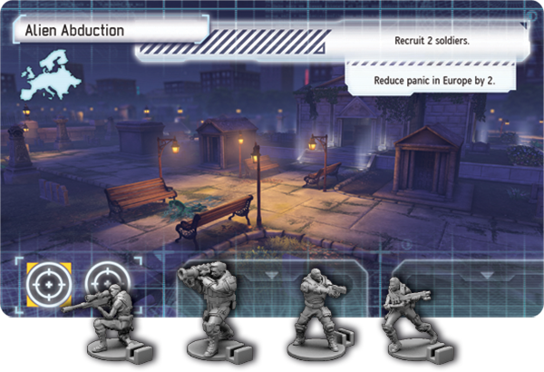 What immediately separates this out from other co-op games like Pandemic and Shadows Over Camelot is the degree of specification each role has. Rather than the usual arrangement – each player having the same actions but with one special move – there’s practically no overlap in each persons goals and abilities. The Commander deploys the Interceptor jets to take down UFOs, chooses which Crisis will effect the team and makes sure you don’t exceed the budget. Chief Scientist chooses new technology cards to research and assigns scientists to the task. Squad Commander assigns soldiers of different types to missions and base defence. The Central Officer deploys satellites into orbit and communicates instructions from the app. Everyone has an equally important role to play, with the Chief Scientist needing to keep track of available upgrades that will be essential to winning the game, while the Squad Leader has to makes the right call on which soldier to place where to avoid casualties and defend the world, while the Commander prevents them both from over-spending in one area causing problems elsewhere.
