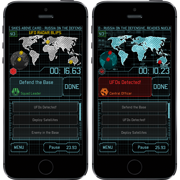 Every round of play goes through the Timed Phase and then the Resolution Phase. The Timed Phase essentially sets the board for the second half where results are determined. Tasks are relayed one at a time from the app on a phone, tablet, etc., and given to the rest of the team by the Central Officer. Whether it’s deploying troops, picking a research focus, placing invading UFOs or collecting the budget you’ve got a limited amount of time to make your decision – usually about 10 seconds – before the game moves on. Once everything is set up the non-timed resolution phase allows players to complete missions, build technologies and everything else through dice rolls. You can keep rolling as long as you have units on the task, but every roll raises the threat level. It becomes a push-your-luck mechanic where the odds increasingly stack against you and you’re more likely to lose your assets. At the end of the round you input data about the global state of panic and damage done and it sets up the next round.