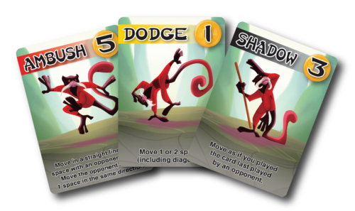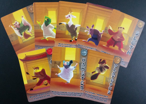 This is a bright and colourful game whose family friendly design belies the diabolical challenge of this game. Everyone gets a ‘ninja clan’ that they will play as, each one a different animal. Amusingly enough they’ve gone with animals types not usually associated with martial arts, leading to the clans of flying squirrels, polar bears, puppies, platypuses and more. You also have a little team of ‘Ninjeeples’, awesome little Meeples in a range of wicked kung-fu moves. The rest of the game is made up of cards, each one featuring a particular ninja move.