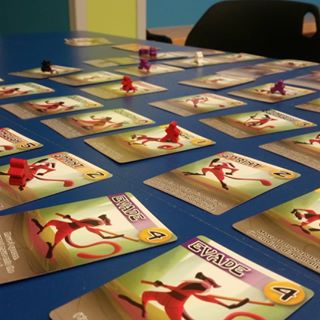 During the rest of the set up the cards are laid out in a grid in the middle of the table and players take turns to place three of their Ninjeeples on the grid. You also begin with two basic moves – Evade and Sprint. On your turn, you select one of the cards and play it, then apply the action to one of the Ninjeeples. For example, Sprint moves a Ninjeeple in a straight line until they reach the edge of the grid or another obstacle. The turn ends by picking up the card your Ninjeeple moved off, adding it to your hand.