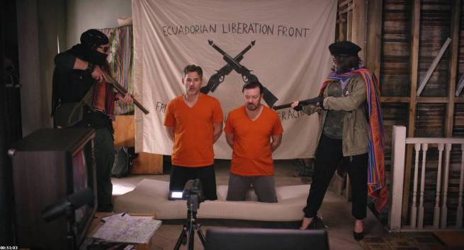 However, Vera Farmiga steals the show as Albert’s not-so-depressed wife. She seems like a more fitting lead character to poke more satirical fun at the current nature of news media. She stifles the joy she feels for finally being free of Albert and takes the opportunity to promote her debut album with a patriotism pandering song about her POW husband. She also starts a relief charity that earns her millions. Her deadpan wit is more like the biting comedy we have come to expect from Gervais rather then the adventure-of-errors it devolves into, the kind of overly conceptual ’80s comedy that might feature John Candy or a pre-prestige-picture Tom Hanks.