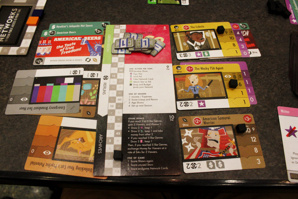 We’ve had the chance to unbox it and play a couple of rounds, all of which I won, so this already gets a ringing endorsement. Up to five players take on a fictional television network with such shows as ‘Get to Know Your Colon’ and ‘What’s in My Pocket?’ along with an advertisement and a piss-poor celebrity to start them out. The shows you get at the beginning don’t bring in any viewers, and with the goal of the game being to have the most viewers this is a problem. Over the course of 5 seasons you have to decide how best to use your resources to achieve this goal.