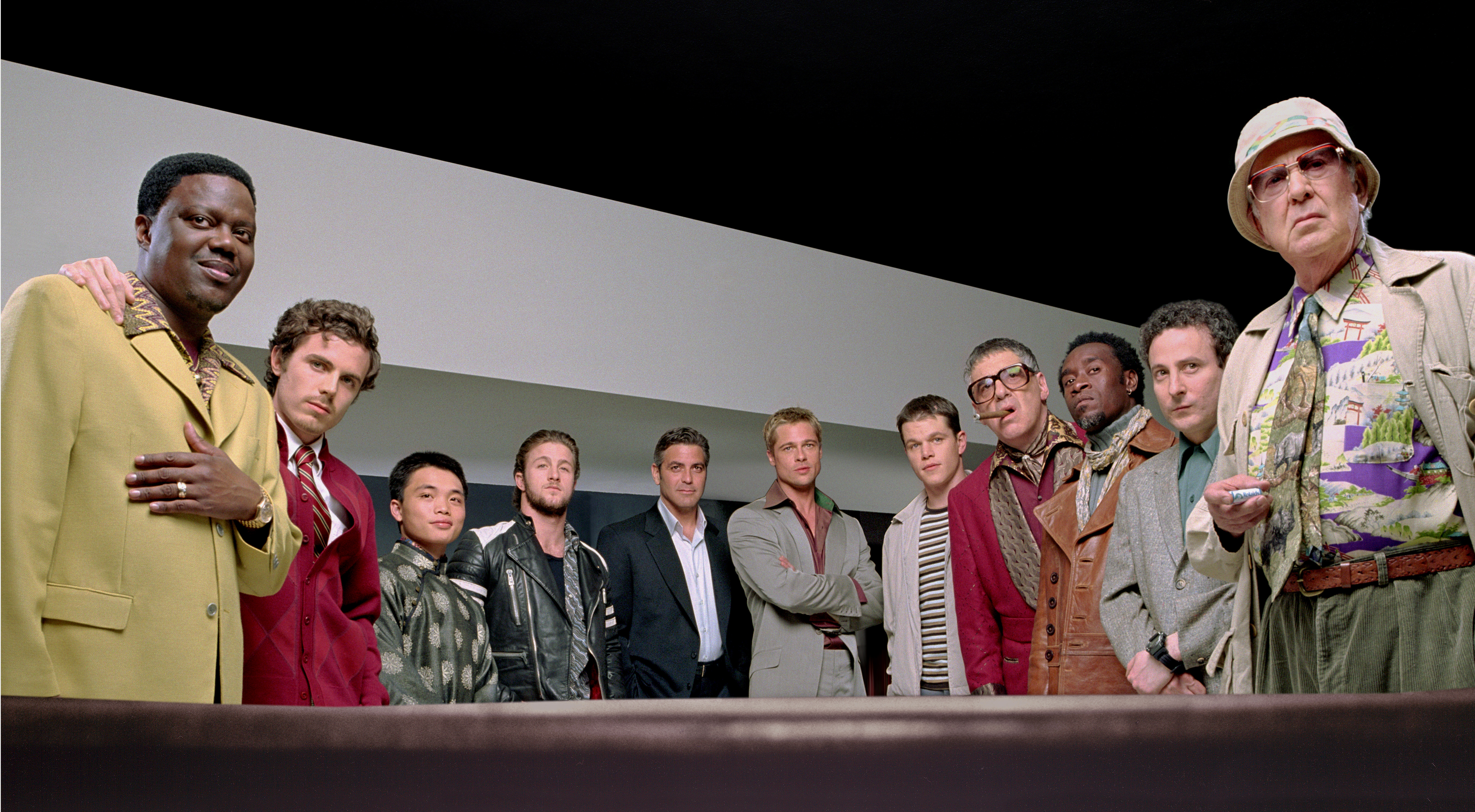 Then there’s the gang. Ocean’s right hand man becomes the perpetually eating, dryly sarcastic ‘Rusty’ Ryan (Brad Pitt) who mostly exists for Clooney to bounce dialogue off. Linus (Matt Damon) is a young pickpocket being mentored by Danny and Rusty, Reuben (Elliot Gould) is an old school Vegas figure who bankrolls the project, Basher Tarr (Don Cheadle) is a limey speaking demolitions expert and comic relief and Saul Bloom (Carl Reiner) is a retired con-man who plays different characters to work the job. Filling out the secondary roles are the constantly bickering Mormon Twins who work as drivers and undercover men (Scott Caan and Casey Affleck), nervous and neurotic technology expert Livingstone (Eddie Jemison), acrobatic ‘grease man’ The Amazing Yen (Shaobo Qin) and inside man Frank Cattan (Bernie Mac). The cast and characters are substantially more diverse and more distinctive, each having their own recognisable traits. You’d be pressed to name more than a couple of the original cast, but this one can be individually picked out by their silhouettes.