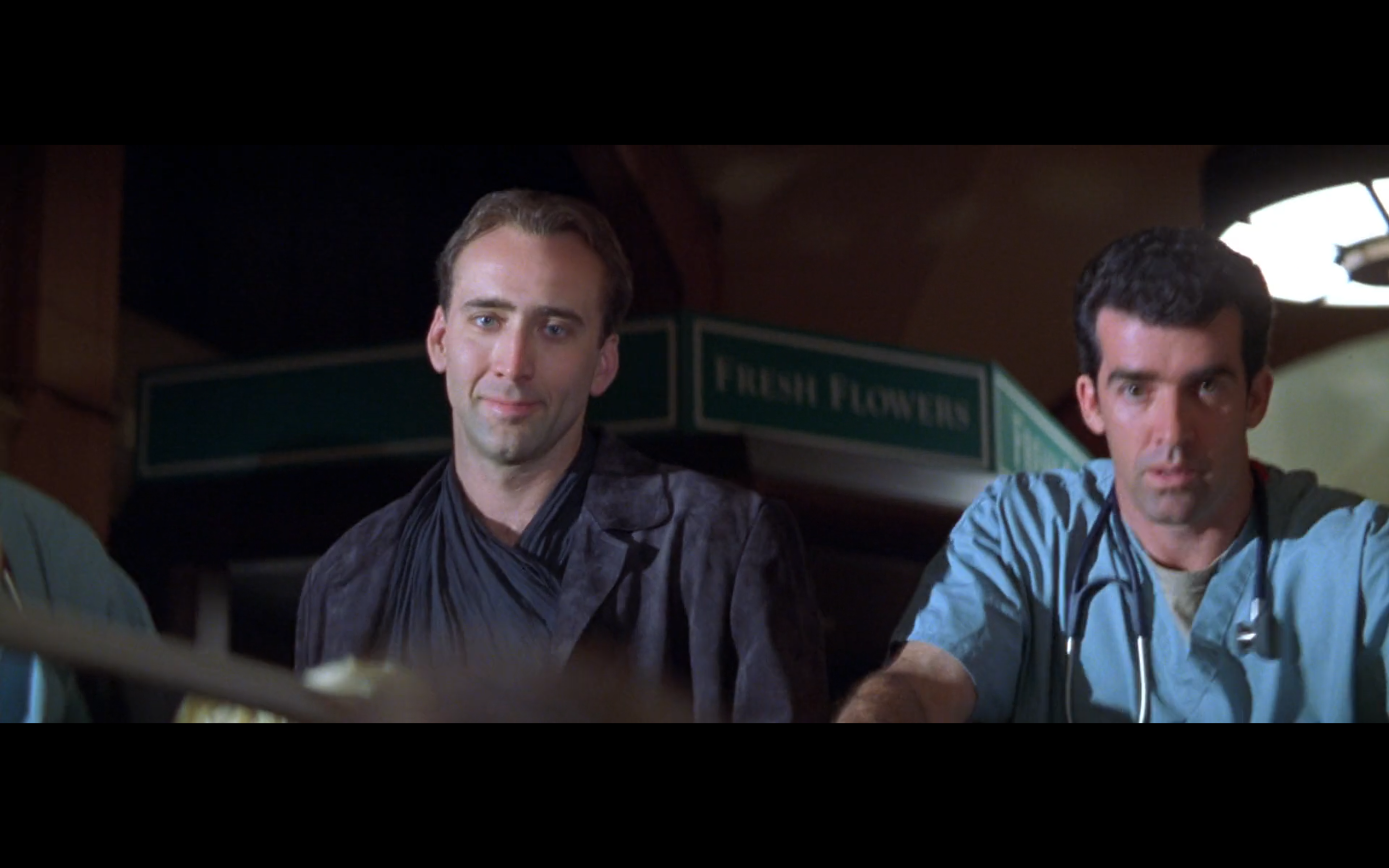 Peter Falk as the fallen angel is replaced with the fictional character Nathan, one of Maggie’s patients. This character is genuinely fun, and takes a firmer line of the pros and cons of becoming human while embracing hedonism. The concept of ‘falling’ is taken much more literally this time around. In Wings it’s a shift of presence, done very subtly with a pan and change in colour. Nic Cage has to climb to the top of a tall building along with background chanting and orchestral music before jumping off with a sweeping, gimmicky camera shot.