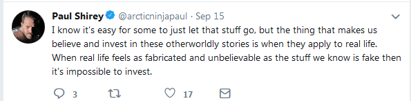 That last line is what clinched it for me. I mean good God there’s so many leaps in logic that it boggles the mind. I’m supposed to believe that when two bullies pull the fire alarm, and the autistic child gets left behind that his teacher didn’t try to grab him on the way out? Or that Emily would allow her ten-year old autistic son to go strolling around the neighborhood in Predator tech COMPLETELY unaccompanied? Or that somehow the facility that they are transferring the “loonies” from just happens to be a hop, skip, and a jump away from the Project Stargazer building. I mean….