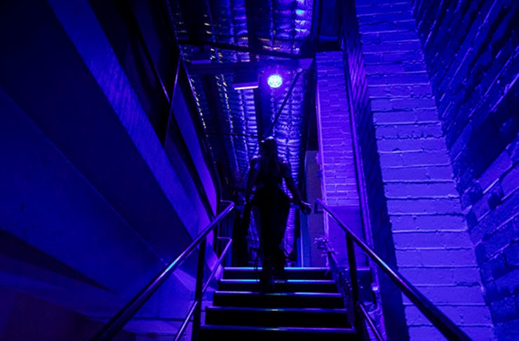 ‘A Midnight Visit’ is best described as a piece of ‘interactive theatre’. That’s a phrase that rarely turns into an entertaining evening in my experience, but the premise here intrigued me. So after see the rather aggressive yet impressive one-woman circus act we drove across town to an old, disused girl’s school that shut down almost 60 years ago. Strange neon lights made some windows glow and the faint sound of a heartbeat could be heard. A black carpet lead us up the stairs to the front door.