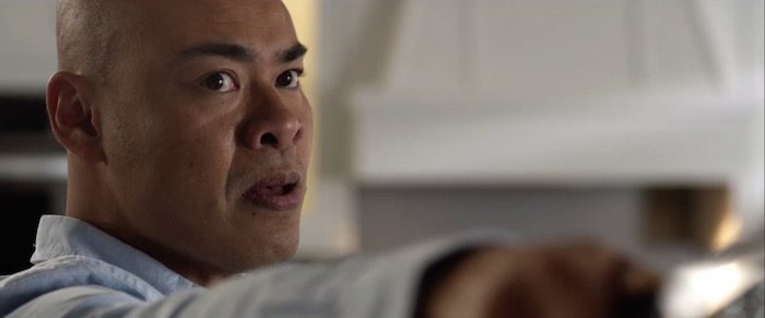 After they talk about it for a while we get some excitement. Friend’s husband finds a kitchen knife in the mother’s purse, prompting a confrontation that results in husband being stabbed in the neck with a knife impaled through a roast turkey because…irony? He doesn’t die, and randomly pops up later in the film for some very unintentional comedy. Meanwhile, the boy is attacked by the weirdo neighbour he was paired with and defends himself by standing between a window and a door the maniac is on the other side off.