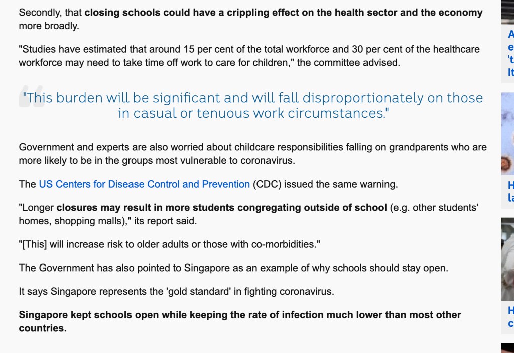 They have repeatedly told us that they think transmission rates are lower among children, that they won’t get as sick as adults, and children are more likely to be infected by an adult than another child. The time to get in front of the crisis by locking down the nation has been and passed. Our leadership weighed the value of children in time of a pandemic and damage to the economy and made their decision.