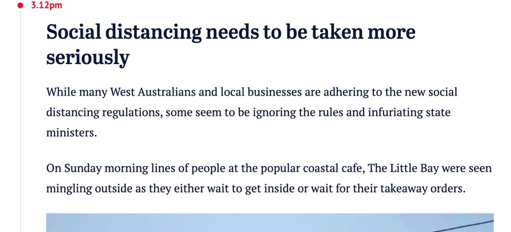 Scott Morrison and the state premiers have been consistent in their message: adopt social distancing and self-isolate. Just one problem here…they haven’t been clear on what this means and who it applies to. There are a range of understandings of this from ‘stay in your house’ through to ‘socialise but in the open air’. Perhaps it means only adhering to the rules concerning gatherings of 100 or less, or space out 4 square metres.
