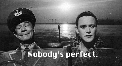 The Scene: Joe and Jerry (Tony Curtis and Jack Lemmon) may have thought they escaped the wrath of mob boss Spats Columbo (played by gangster movie staple George Raft) by adopting drag personas and hiding out in an all-woman band in Florida. But the gangster and his crew just happen to show up there and naturally hijinks ensue. The two men are constantly changing between themselves and their Josephine and Daphne personas trying to escape. They realize their best chance of escape is Osgood Fielding III (Joe E. Brown), the aging millionaire who has been crushing on “Daphne” the entire film and just happens to have a yacht. Joe grabs Sugar Kane (Marilyn Monroe) and reveals his feelings for her as they race away. As Osgood drives them out to the yacht on his speedboat, Joe finally confesses everything to Sugar, and despite his deceptions she has fallen for him anyways. Joe (still dressed as Daphne) sits in the front seat with Osgood trying to convince him that they would not work out because of a number of vices he/she engages in. He dismisses each argument with a fuss. With no other choice left, Joe tears off his wig and confesses to being a man the entire time, and to the surprise of everyone the movie closes with Osgood casually remarking “Well, nobody’s perfect”.