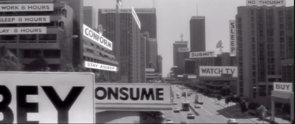 Our hero is Nada (Piper) is a completely ripped drifter looking to make an honest days wage. His suspicion is peaked when street preachers and TV signal hackers repeat the same talking points about the media and enslavement. During a police raid on their shanty town targeting the outspoken, Nada flees along with a box of sunglasses that reveal a disturbing secret. Every TV broadcast and printed publication is hiding messages about obeying, consuming, conforming and reproducing. More disturbing, the wealthy and elite milling around the populous are gnarly looking bug-eyed aliens.