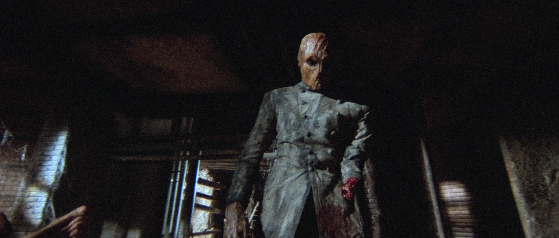 Those hoping for a concise and logical narrative will sadly be out of luck with House by the Cemetery. Fulci prefers to give audiences a trippy nightmare drenched in atmosphere. There are countless plot elements which make no logical sense but taken as part of the overall picture the results are quite effective. It is almost like Lucio Fulci had in mind the scary and intense moments he wanted and used the thinnest of plot threads to reach each of them. There are times this works against House by the Cemetery as it makes the characters come off as incredibly dense. At one point, the family’s matriarch, Lucy comes downstairs and sees the housekeeper Ann wiping up a messy streak of blood and viscera which leads directly to the locked basement door. But the topic of conversation is the fact that the housekeeper had made a fresh pot of coffee. That being said the horror elements of this film is where it truly shines. The sets are a dreary and gloriously gothic taking full advantage of the bleak atmosphere shooting on location provides. Add to that the fact that Freudstein uses the sound of a child crying to lure victims and it all becomes quite unnerving. Aside from Fulci, the hero of this film is make-up artist Maurizio Trani. His work here is absolutely gruesome and violent, going right up to the border of “overboard” but never crossing it leaving a trail of movie violence that is top-notch. The design of Dr. Freudstein in particular is striking, as a creature where every element which was human has faded and all that is left is a monster living off of victims he savagely hacks to pieces.