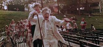 The film is introduced to us by a charming host played by Lincoln Maazel, who Romero fans will recognize from his criminally underrated film Martin, in the same fashion as Edward Van Sloan with Frankenstein. He sets the stage by discussing the difficulties in life experienced by those who are elderly. From there we follow our nameless protagonist as he ventures through our world as reflected through the whimsy and chaos of an amusement park. We get a fun introduction as our main character rides a TM Harton & Co.-made wooden coaster, but once he gets off the madness begins. It is through this lens the movie unfolds as Romero through trippy stylization shows the elderly as second class citizens in this society. When a collision happens at the bumper cars, the police at the scene are immediately biased against the older couple involved. Con artists are fleecing them in the midway. Our main character is beaten by a biker gang and then ignored when he seeks medical attention. In one of the most memorable scenes, he is chased down by the audience of a stage show who see him as a freak with no use to society. All the while a grotesque specter only the lead character can see sporadically appears to drive home the point of his imminent mortality.