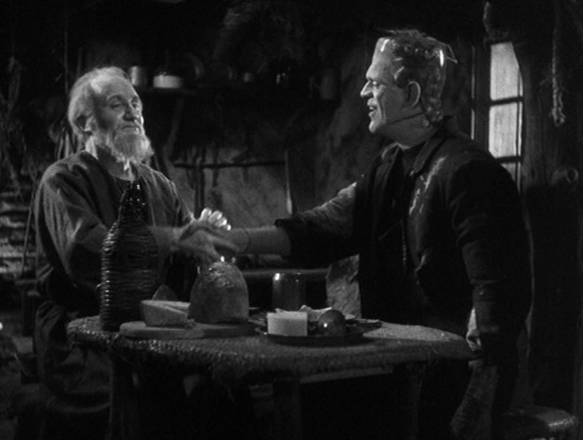 The Scene: After fleeing the abuse and intolerance of society, Frankenstein’s creation (Boris Karloff) finds a cabin in the forest and from within it comes a beautiful music which he has never heard before. The music is played by an old hermit (O.P. Heggie) with a violin, and though he knows someone is lurking around his visual handicap prevents him from seeing who it is. When the monster finally walks in, he finds for the first time that a human shows him kindness and welcomes him into his home. Though he is limited by his lack of vocabulary, the creation’s grunts and facial expression radiates a child-like joy. Though he does not have much, the hermit is gladly willing to share with his new companion. As he prepares a bowl of soup, for the creation he praises God who has brought a cure for his loneliness. He can not see and the monster can not speak and together they can provide a comfort to one another and the next day the hermit sets out to mentor the monster.