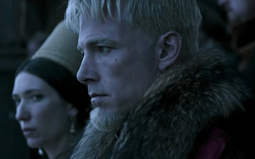 In addition to the excellent screenwriting, The Last Duel boasts some impressive acting performances. Matt Damon is at the top of his game playing de Carrouges as chivalric and honorable, churlish and petulant, or cold and self-obsessed, depending on the chapter. Adam Driver is just as good if not better as Le Gris. Again, depending on the chapter, he can subservient and honorable, quick witted and irascible, or unrepentant and foppish. Even Ben Affleck brings an anachronistic, bro-ish take to his Count Pierre that somehow works. He’s charming and fun to watch even if his character is morally bankrupt, thoughtless, and revels in debauchery.