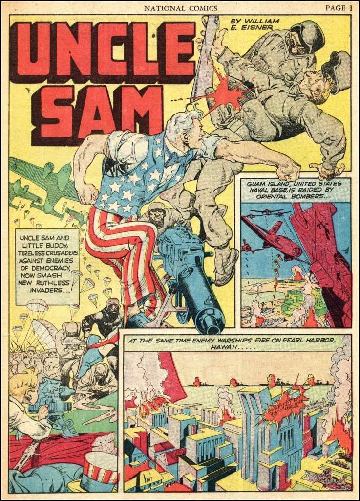 Pearl Harbor Attack (National Comics): Just because the United States was not yet fighting in World War Il it did not mean they were not involved. President Franklin D. Roosevelt proclaimed the nation “the arsenal of liberty” as weapons and supplies were sent to the British while the Axis nations were cut off. The tension this created with Japan built up until they bombed the naval base at Pearl Harbor. This attack was something completely unforeseen….unless you had read National Comics #18 just the month prior. In this issue the character of Uncle Sam deals with the furthering aggression from enemy nations including an attack on the Hawaiian naval base