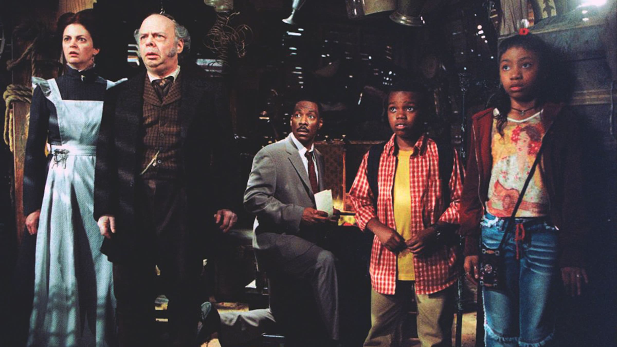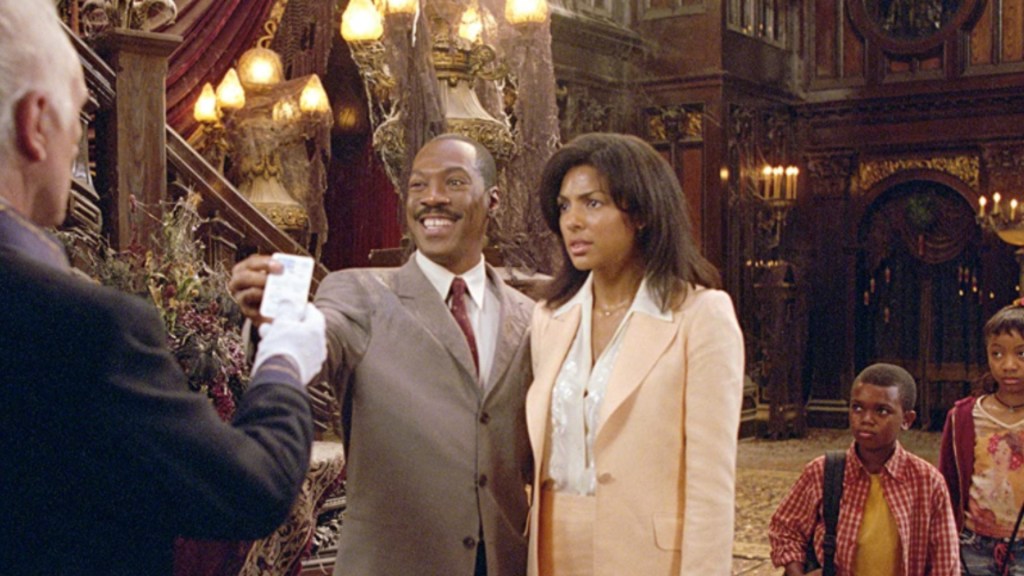 First of all, it feels as though there was a drastic tone shift between the script and production stages. There’s little inherently comedic about the set-up or the story, with a simple family adventure being the core of the experience, and yet Eddie Murphy as Jim Evers is determinedly trying to turn it into a whacky comedy. It feels like they wanted it to be an adventure film until Murphy was cast, and then encouraged him to riff on the material to make it a comedy. He’s the only character playing it as a comedy, and no-one else responds to him with anything but annoyance. It’s certainly not meant to be a horror movie, so its jarring when the movie opens with a man hanging himself on camera and later Murphy sees his face gruesomely melting off in a mirror. It doesn’t sit right alongside Murphy gurning like an idiot. This is what pisses me off about this movie though.
