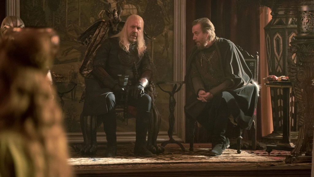 In the intervening years, Viserys has soured on politics. Even though Jason Lannister (Jefferson Hall) presses his concerns regarding the Stepstones, Viserys brushes him off. Viserys is clearly heavier, more inclined to drink, and more interested in hunts, balls, and tourneys as Lord Corlys previously claimed. Even though Ser Vaemond (Corlys’ brother) implores Viserys for assistance, the war in the Stepstones is unsanctioned and Otto, and by extension Viserys, believes it will make the crown appear weak.