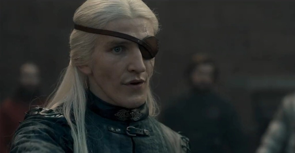 Jace and Luke take a tour of their old haunts, specifically the training yard. Luke’s clearly disturbed by all the stares and knows that it is because he doesn’t look like Laenor. While Jace counsels him to ignore the stares, it is clearly not so easy for Luke. Moreover, in that time Aemond has become a skilled warrior able to best Ser Criston Cole. (Another character who appears unaffected by time.) Aemond seems much like a younger Daemon with zero compunction or tact. You know all you need to know about Aemond when he says, “I don’t’ give a shit about tourneys.” Aemond seeks out real combat, not some artificial nonsense. Before Aemond can challenge Luke and Jace however, Vaemond enters to much pomp and circumstance and is followed by a large retinue. If this was a dick-measuring contest his cock would already be out and a tape measure in his other hand.