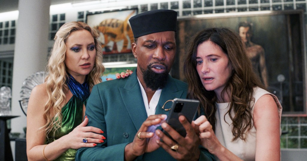 Although everyone contributes in a meaningful way, the standouts for me (aside from Janelle Monae who I’ll get to in a moment) were Dave Bautista’s Duke and Kate Hudson’s Birdie. While outwardly a misogynistic click-hungry Twitch and YouTube streamer, Bautista brings human desperation to Duke’s character. Yes, he’s a jackass and a moron but he’s also someone desperate for real human affection, something he fruitlessly tries to attain online. I continue to be impressed with every career choice Bautista makes. With the asinine “nepo baby” discourse once again rearing its ugly head in Hollywood, it behooves me to note what a true talent Kate Hudson is, regardless of her parentage. Her Birdie is delightfully vapid, carelessly willing to have penthouse parties in the middle of the pandemic, a character who needs to have her assistant Peg (Jessica Henwick) keep her phone lest she tweet an ethnic slur—again.