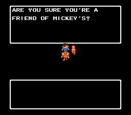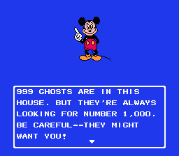 We should mention this ghastly image. Each failure brings you the dire face of Mickey telling you that you made a terrible mistake and have to start over. There’s something unpleasantly earnest about the art style…I think they tried to make his more detailed. The limitation of an 8bit system means that any character is going to be an assemblage of small squares, and you mostly want to get across the idea of your character instead of a visually accurate recreation. What we get is a visage that wouldn’t be out of place in a creepypasta.