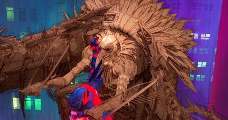 As mentioned above, the mix of animation styles on display is fascinating all on its own. The da Vinci style Vulture was just a taste – albeit one we want an entire buffet of – with Spider-Punk being the wildest. It’s little wonder that he barely featured in the trailers as he must have taken hours to render. He’s made up of the torn newsprint style popularised by the 1970s British punk movement with the colours, textures and design shifting in full anarchy style. It says something about how our ability to process visual information that we can make any sense of this movie at all. Background details shift in and out of focus and the colours seperate, watercolours blend and mix together, and some key characters appear as unfinished sketches and frameworks. It’s an absolute trip.