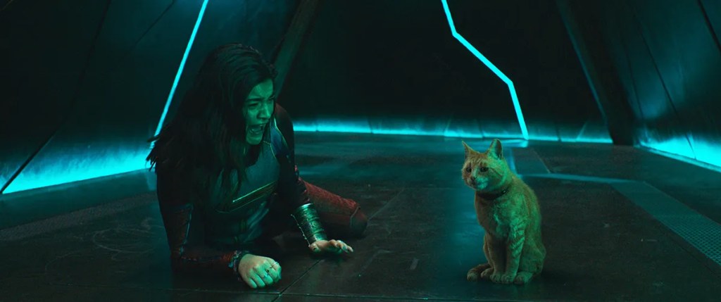 Maybe we’ve gotten spoilt with Killmonger, Thanos, Namor, Kang and other interesting villains, because Dar-Benn feels like they have very little going on. Performance and design are just fine, but we know very little about this foe. They’re most distinctive feature is the ‘Universal Weapon’, the hammer originally wield by Ronan the Accuser. When the most recognisable aspect of the character is lifted from another, more compelling villain you’ve got a bit of a problem. As someone to bring together three characters for some punching…it’s fine.